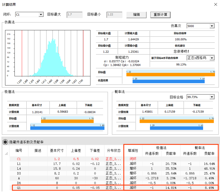 從計(jì)算參數(shù)中可以看出3DCC軟件進(jìn)行公差仿真時對三維數(shù)模中標(biāo)注的“輪廓度”進(jìn)行了自動處理,并且分析得到了輪廓度的傳遞系數(shù)及貢獻(xiàn)率,自動判斷出輪廓度的增減性,綜合分析了輪廓度對閉環(huán)結(jié)果的影響。