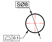 圖中輪廓度標(biāo)注含義為:公差帶寬度為0.1,公差值是相對于理論正確尺寸Sφ8對稱分布的,即球面輪廓度的公差值為0±0.05。