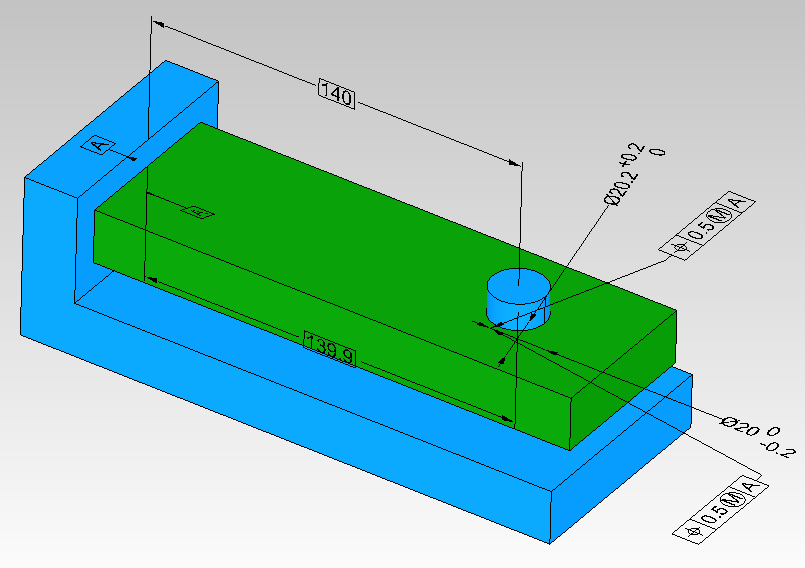 下面我們通過一個案例進行分析,如下圖所示,零件A和零件B通過孔軸裝配后,計算左側(cè)位置兩零件的間隙大小,分析是否發(fā)生干涉(不考慮旋轉(zhuǎn)誤差,只考慮平移方向誤差,分析在自由浮動以及徑向受力兩種情況)