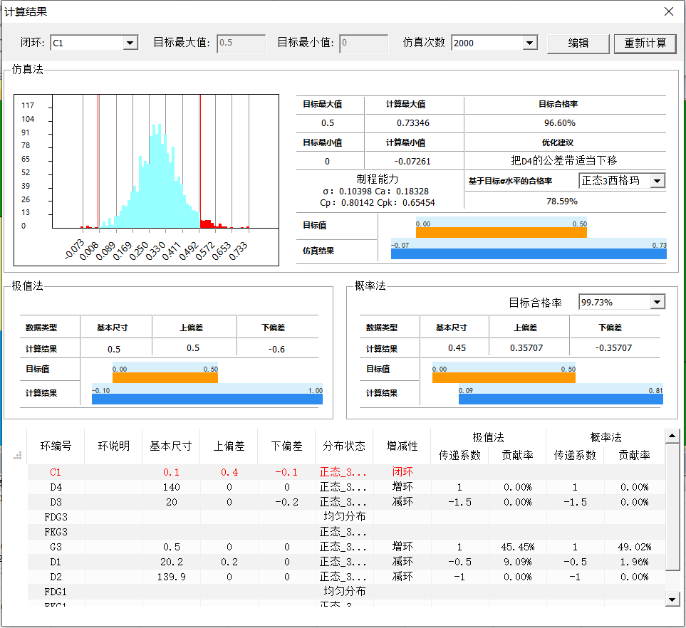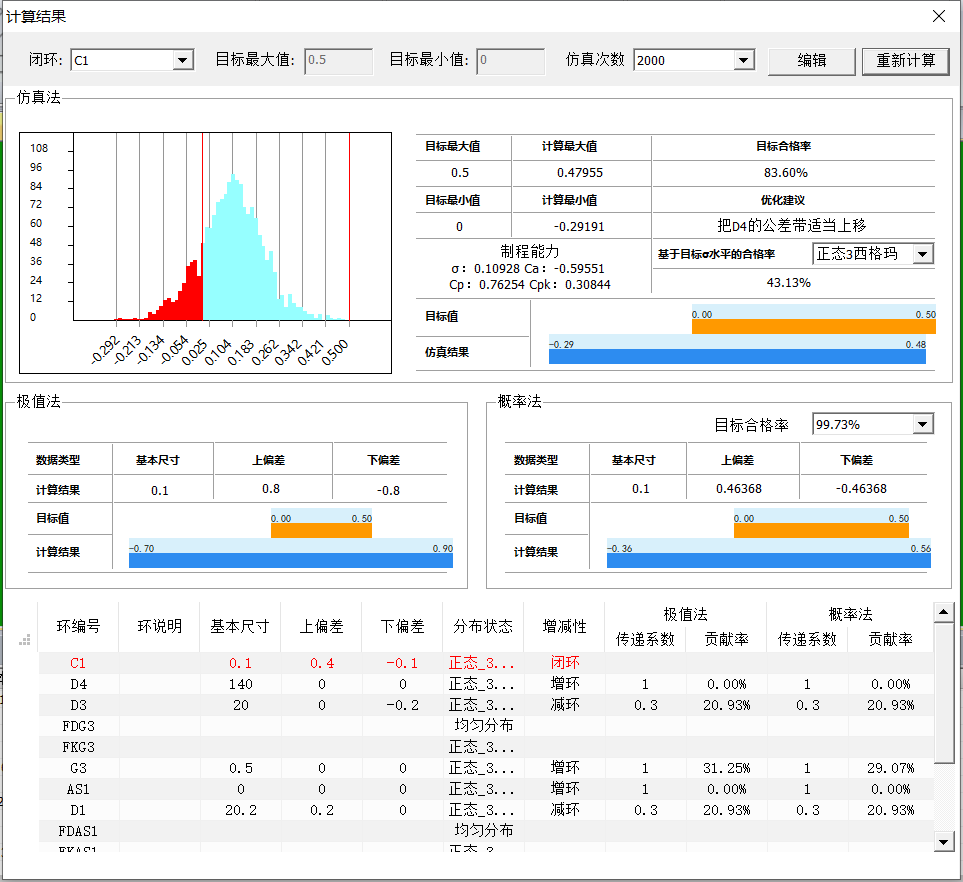 參考極值法結(jié)果,得到孔軸裝配干涉量為-0.1mm。